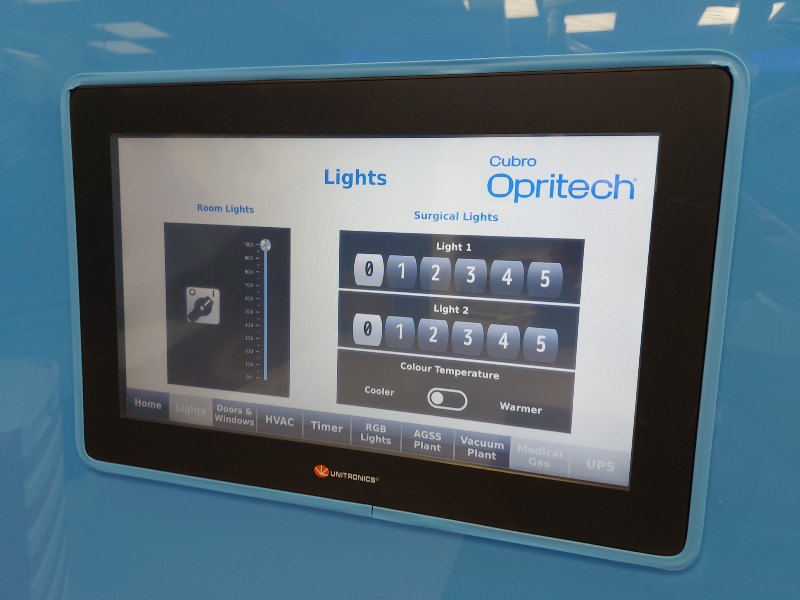 Within the modular operating room ceiling we integrate sealed IP56 recessed room lighting that uses LED drivers with colour and intensity control. This saves energy and provides environment visual control of the O.R. lights are controlled via a combination of push button switches near the theatre entry doors, ceiling mounted PIR sensor and further function control on the system touch panel.