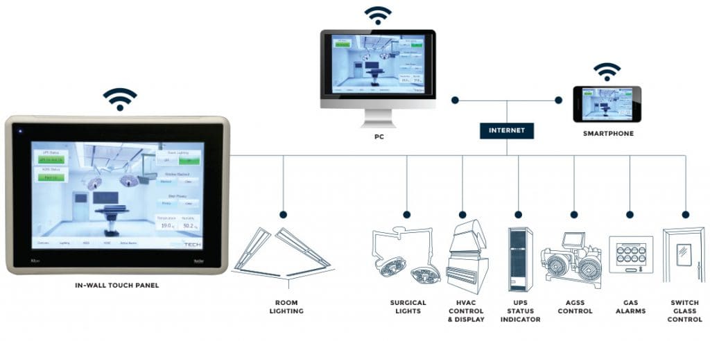 Operating Room System Controls have been developed in-house by Opritech and use an intuitive in-wall touch panel interfacing with systems such as room lighting, surgical lights, AGSS, HVAC, UPS, Gas Alarms, Switch Glass Windows.